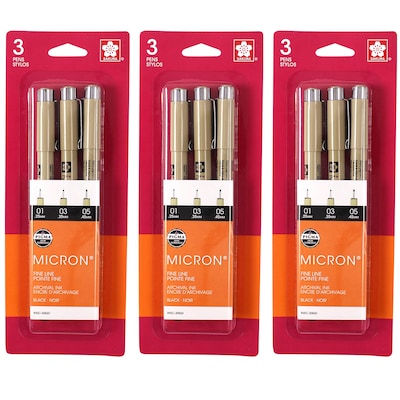 - 3 per pack in sizes 01, 03, 05, sold as 3 packs for a total of 9 pens.