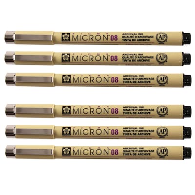 Pigma Micron pens are waterproof and permanent fineliners that are loyally used by designers, scientists, archivists, architects, Manga artists, cartoonists, illustrators and hobbyists. The fine nib makes this pen ideal for creating both technical and artistic drawings. The fineliners have a protective metal sleeve around the extended tip to give extra control and increased resilience when used with drawing aids such as rulers. This permanent, fade resistant, chemically stable, pigment-based ink will not bleed or run if liquids are spilled on or applied to the document after the ink has dried. Perfect for legal situations, Pigma ink is nearly impossible to alter on documents, in log books, or on checks. Architects, archivists, anthropologists, entomologists and laboratories depend on Pigma Micron for record keeping. Pigma Micron is the first disposable technical pen using archival pigmented ink. It does not smear, feather, or bleed through on most paper. Sold as a pack of 6. Specifications: Working temp.: 5°C - 40°C Ink type: Water-based pigment ink Size: 135 mm