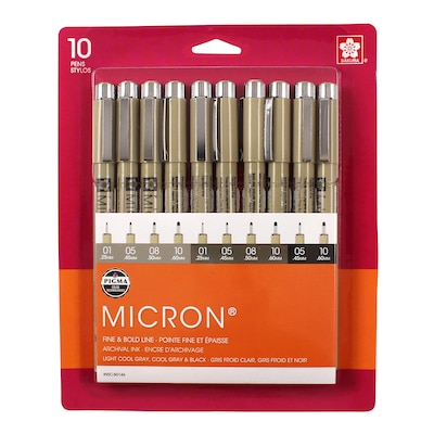 The fine nib makes this pen ideal for creating both technical and artistic drawings. The fineliners have a protective metal sleeve around the extended tip to give extra control and increased resilience when used with drawing aids such as rulers. This permanent, fade resistant, chemically stable, pigment-based ink will not bleed or run if liquids are spilled on or applied to the document after the ink has dried. Perfect for legal situations, Pigma ink is nearly impossible to alter on documents, in log books, or on checks. Architects, archivists, anthropologists, entomologists and laboratories depend on Pigma Micron for record keeping. Pigma Micron is the first disposable technical pen using archival pigmented ink. It does not smear, feather, or bleed through on most paper. Contains sizes 01, 05, 08 and 10 in light cool gray; sizes 01, 05, 08 and 10 in cool gray and sizes 05 and 10 in black. Specifications: Working temp.: 5°C - 40°C Ink type: Water-based pigment ink Size: 135 mm