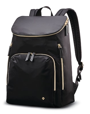 This Samsonite laptop backpack is made of water-resistant nylon material and features a padded laptop compartment and a tablet pocket. It also has a front organizer pocket, a side water bottle pocket, and a smart strap.