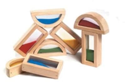 Guidecraft® Rainbow blocks in sand color feature hardwood, acrylic with plastic beads and include 4 rectangle/4 half moon shapes. Blocks indulge child's appetite for exploration by merging blocks together to form new colors and sound.