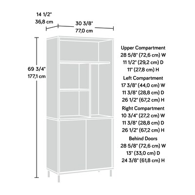 Beautify your home with the modern design of this library with doors from the Acadia Way collection. This beautiful library bookcase with doors features multiple spacious shelves and cubbies that are ideal for storing and displaying just about anything from your collection of novels and work binders to knick-knacks and decorative plants. One adjustable shelf in the open display area allows you to accommodate items of various heights. Behind the storage doors is a hidden area featuring one large adjustable shelf, allowing you to customize this 5-shelf bookcase to fit large books, board games, organizing bins, and more. Charging your phone, laptop, or tablet has never been easier, or more discreet, because this modern bookcase features an enclosed back with pass-through cord access. With a mixed material aesthetic and accented with metal feet for durability, this open storage bookcase elevates any room it is in. Finished in a dark Raven Oak with Timber Oak accents, this library bookcase brings the latest furniture trend to your home.