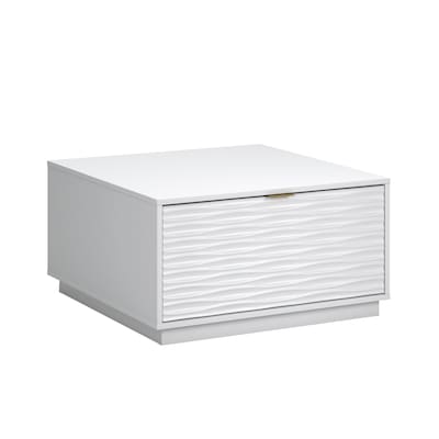 Tuck away books, blankets & more with the Morgan Main white coffee table from Sauder. Two drawers & a wave design make this useful for modern living rooms.