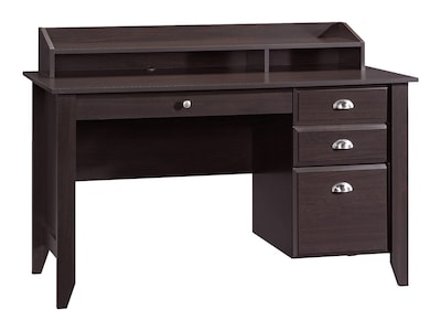 Create a well-organized work space with this jamocha wood writing desk. Three easy-gliding drawers store documents and office supplies, while the lower drawer accommodates letter-sized hanging folders for convenient file management. The integrated hutch of this Sauder Shoal Creek desk offers additional open shelving for books or display items, and the built-in cord management system keeps the space neat.