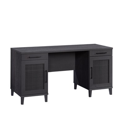 Want to bring a little mix of traditional style with a modern vibe to your office environment" We've got that look with this bold and casual home office desk from the Tiffin Line collection. Add relaxed charm and upgraded function with a double pedestal desk featuring stylish door fronts with rattan inserts, two storage drawers with full extension slides, and a cord management system with desktop grommets for cord pass-throughs. Storage behind each door includes an adjustable shelf and pull-out hanging file storage gliders that hold letter or legal size hanging files to help keep those important files close at hand. This pedestal desk with drawers has impact resistant, high-grade thermoplastic edges and meets BIFMA testing standards to withstand the rigors of everyday wear and tear. It also accommodates optional Hidden Wireless Qi Charger by Eggtronics 425905 (sold separately visit sauder.com for more information). Finished on all sides in a dark Raven Oak, this computer desk with doors will refreshen and invigorate any office setting.