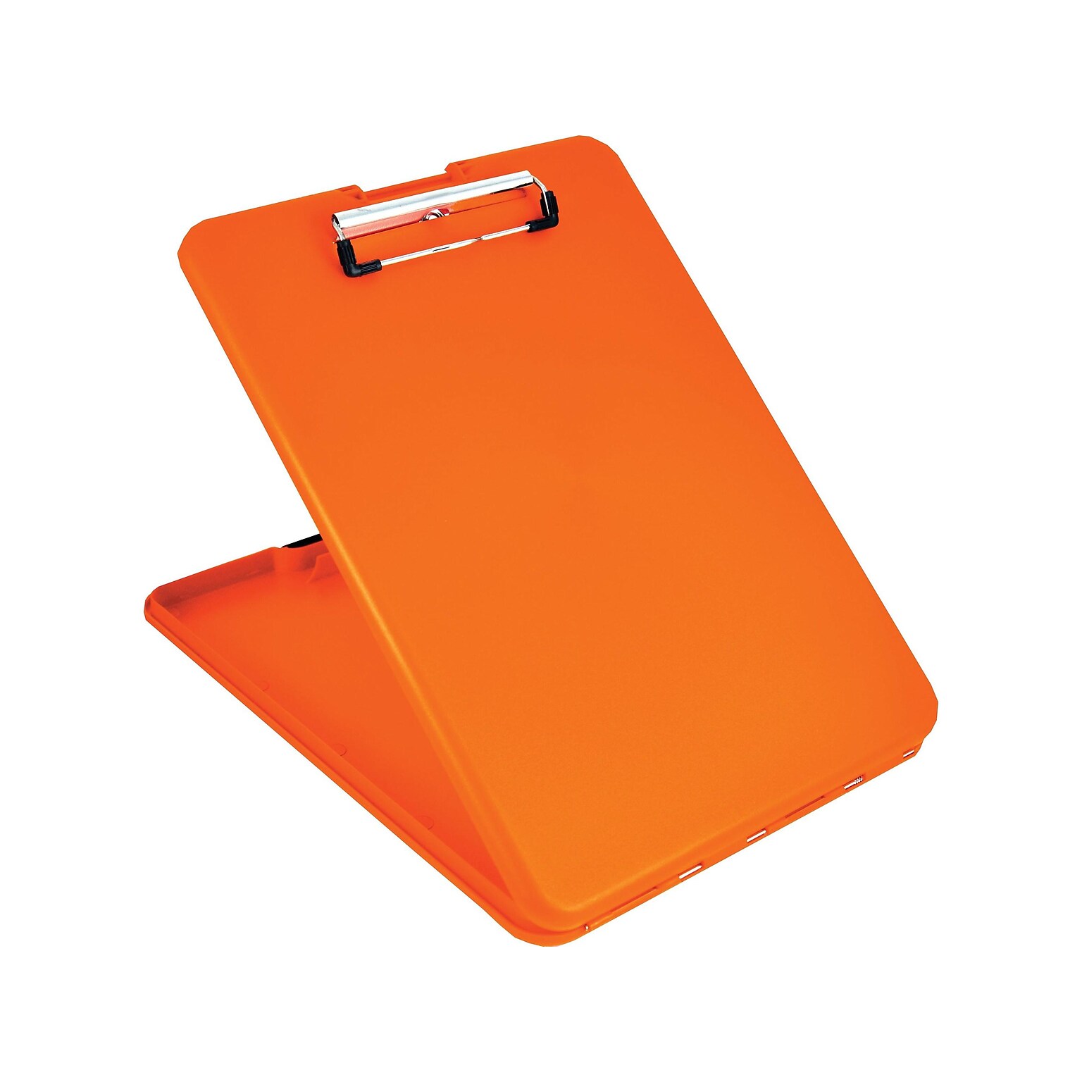 Fill out papers away from your desk with this letter-size safety orange storage clipboard. The bright coloring lets you use it for a color-coded system, while the low-profile clip holds papers firmly in place without obstructing images or text. This SlimMate letter-size storage clipboard can hold up to 0.5 inches of paper in the storage compartment and keeps contents safe from weather, ripping and other damage.