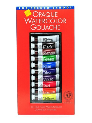Vibrant and brightly-colored, The French School opaque water-based gouache paints can be applied directly from the tube or thinned with water for transparent watercolor effects. These versatile, easy-to-use paints are ideal for students and artists of all ages. An excellent choice for color theory instruction and other educational purposes. They can be used on a wide variety of surfaces, including paper, hardboard, plastic, wood, and metal. Certain colors are less opaque than others. Washable and non-toxic.Set of 10 in a case with brush contains one 10 ml tube of each bright orange, bright white, burnt sienna, deep violet, ivory black, permanent green, primary blue, ultramarine blue, primary yellow, and primary red. Set of 20 in a case with a brush contains one 10 ml tube of each ultramarine blue, primary yellow, primary red, bright white, burnt sienna, deep violet, ivory black, permanent green, primary blue, bright orange, lemon yellow, vermilion red, rose magena, carmine red, yellow ochre, cobalt blue hue, turquoise blue, light green, emerald green, and burnt umber.