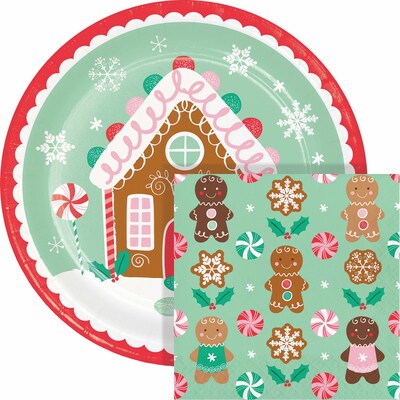Each Holiday Sweets Paper Plates and Napkins Kit includes: 16 Holiday Sweets Dinner Plates (9") and 32 Holiday Sweets Dinner Napkins (6.5"). Bring sweet charm to your Christmas celebration with help from our Holiday Sweets Paper Plates and Napkins Kit. Including premium-quality paper plates and napkins, this 48-piece kit is ready to help serve a meal to up to 16 guests at your holiday gathering. The included party supplies feature gingerbread houses, gingerbread friends, and candies accented by a snowy scene and a dreamy pastel color palette. Complete the nostalgic Christmas feel at your gathering by checking out our coordinating Christmas party supplies for additional tableware, decor, and more.