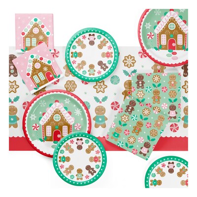 Each Holiday Sweets Tableware Kit includes: eight Holiday Sweets Dinner Plates (9"), eight Holiday Sweets Dessert Plates (7"), 16 Holiday Sweets Dinner Napkins (6.5"), 16 Holiday Sweets Beverage Napkins (5"), and one Holiday Sweets Paper Tablecloth (54" x 96"). Add sweet vibes to your Christmas celebration with help from our Holiday Sweets Tableware Kit. With paper plates, napkins, and a paper tablecloth, this 49-piece kit is ready to help serve a meal at your holiday gathering. The included party supplies feature gingerbread houses, gingerbread friends, and candies accented by a snowy scene and a dreamy pastel color palette. Complete the nostalgic Christmas feel at your gathering by checking out our coordinating Christmas party supplies for additional tableware, decor, and more.