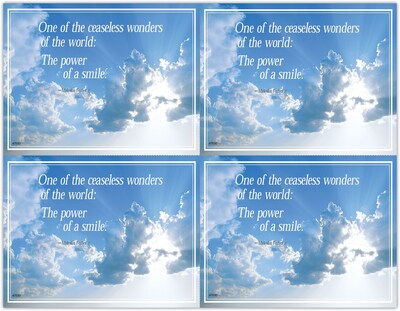 Printed on high-grade coated stock for vibrant color! Full color coverage with rich look and feel. Come 4-up on a sheet with micro-perfs for separation. Blank backs for personalization. Feed easily through laser printers. Card size: 4-1/4 x 5-1/2.