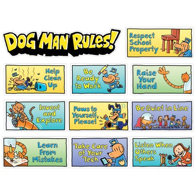 Dog Man rules and so does this mini-bulletin board set. Favorite characters from Dav Pilkey's best-selling Dog Man series hilariously illustrate how (or not) to follow school rules in a display that is sure to grab students' attention.Includes 11 pieces:• Dog Man Rules! banner (23" x 5.5")• 10 class rules cards (12" x 6")• Teaching guide