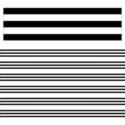 Help your bulletin board displays stand out with black and white border trim! Industrial Chic Black and White Stripe straight borders feature horizontal stripes for a classic look. The Schoolgirl Style line of contemporary classroom accessories takes the guesswork out of styling, managing, and perfecting classroom design. Each collection, designed by Melanie Ralbusky, offers a signature look that transforms empty spaces into extraordinary environments for students to enjoy. Each pack includes 12 border strips, each measuring 3' x 3" for a total length of 36'. Sold as 6 packs for a total of 72 border strips (216 feet).