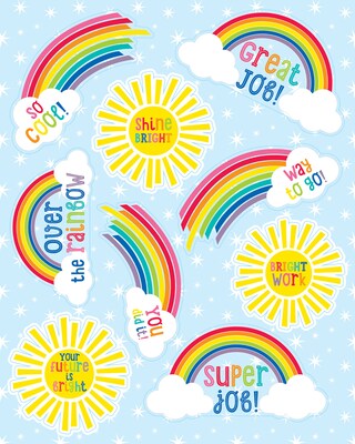 The Hello Sunshine Motivators Motivational Stickers feature positive messages such as:– So Cool!– Way to Go!– Super Job!– Bright Work– You Did It!This pack of motivational reward stickers contains 6 sheets of 9 colorful die-cut stickers for a total of 54 (4 1/2" x 5 5/8") stickers.