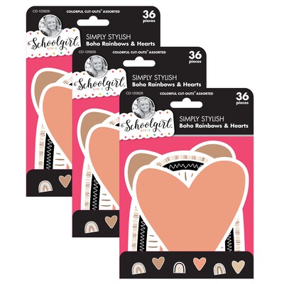 A fun and budget-friendly way to decorate your classroom! This pack of assorted Simply Stylish Boho Rainbows & Hearts Colorful Cut-Outs features peaceful colors that are sure to add a touch of kindness to any space. Each pack includes 36 cut-outs (18 rainbows: 6 each of 3 designs, 18 hearts: 6 each of beige, brown, and coral). Sold as 3 packs for a total of 108 cut-outs. Printed on durable cardstock, these cut-outs are ideal to use as desk tags, cubby tags, and much more. Pair the classic black-and-white stripes and polka dots of the Simply Stylish collection with soft pops of color to create a warm and welcoming atmosphere in any room. Schoolgirl Style's™ line of trendy classroom accessories helps to take the guesswork out of styling and managing classroom design. Each collection, designed by Melanie Ralbusky, offers a signature look that will transform empty spaces into extraordinary spaces for students to enjoy. The variety of décor options in the Schoolgirl Style™ collection makes it possible for anyone to design and decorate classrooms that inspire learning and joy!