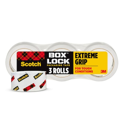 Scotch Box Lock Packaging Tape sticks instantly to any box! It has the power of extreme grip to ensure boxes stay securely sealed, even during rough handling. Its new advanced adhesive creates a secure seal over box edges, and its thickness and durability reduces splitting and tearing and makes it easier to find the start of the roll. This tape can be used to seal any type of box, including harder-to-stick to 100% recycled boxes.