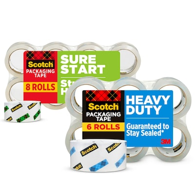 Scotch Sure Start Shipping Packaging Tape is tough, strong tape that comes off the roll easily and smoothly with no slivering or splitting. Scotch Heavy Duty Shipping Packaging Tape uses strong, tough, solvent-free hot melt adhesive to lock in your heavy duty contents and lock out everything else, while resisting splitting and tearing.