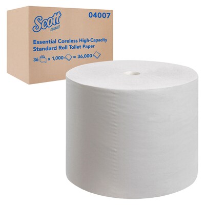 - 1,000 Sheets/Roll; 36 Rolls of Scott Essential Coreless High-Capacity Standard Roll Toilet Paper/Case; 36,000 Sheets/Case; 2-Ply; White