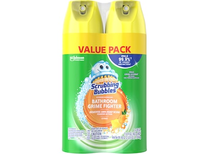 The Scrubbing bubbles Bathroom Grime Fighter aerosol is a multi-surface facility disinfectant spray with a penetrating foam that takes on grime wherever it hides and kills 99.9% of viruses and bacteria. With this all-purpose cleaner, a clean bathroom is only a spray away. The Bathroom Grime Fighter aerosol is best for cleaning large bathroom spaces (such as a bathtub or shower) and in hard-to-reach places (such as between tiles and around fixtures). This 100% soap scum remover also delivers an amazing citrus fragrance. This aerosol is an effective tile, sink, bathtub and shower cleaner, as well as an overall bathroom cleaner. This disinfectant cleaner is an easy way to get tough on bathroom surface messes. When used as directed, kills: herpes simplex virus type 1/2, influenza A (H1N1) virus, respiratory syncytial virus, Rotavirus, Staphylococcus aureus (staph), Salmonella enterica (salmonella), Pseudomonas aeruginosa, Escherichia coli O157:H7 (E. coli), Listeria monocytogenes.