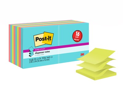 Post-it Super Sticky Dispenser Notes, 3" x 3", Neon Collection, 90 Sheets/Pad, 16 Pads/Pack (R33012SSMIA+4)