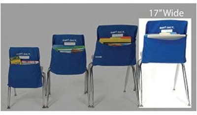 Seat Sack Large seat sack in blue color slides on the back of a chair to provide instant storage of books, papers, school supplies and more. Sack measuring 10" x 17" is made of sturdy laminated flame retardant fabric.