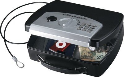 Sentry® Safe Electronic compact safe is programmable electronic lock with 2 user codes with durable solid steel and easy grip handle and soft interior lining and automatic 20 second time delay after 3 incorrect entry attempts.