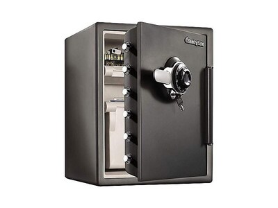 Ensure essential files, flash drives, and other accessories stay secure by storing them in this 2-cubic-foot gray water-resistant fire safe. The steel construction protects contents from dings, damage and forced entry, while the fire-resistant design lets this safe withstand temperatures up to 1700 degrees Fahrenheit. With multiple compartments on the interior, it's easy to keep stored contents organized, and the 2 cubic feet of space offers plenty of room for small or medium items. Included hardware lets you bolt this safe to the floor, so thieves can't remove it from your home or office. This SentrySafe 124.8-pound fire safe keeps out water and is accessible by both a combination and keys for convenience.