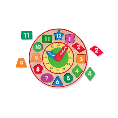 Our popular preschool-friendly clock gets a cool update! A larger face, exposed natural wood, and pops of vibrant color on match-able chunky pieces make for a fresh modern look