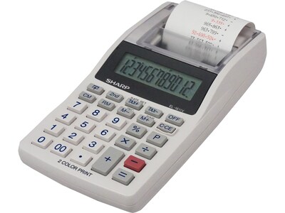 The Sharp EL-1611V electronic printing calculator features an easy-to-read large 12-digit display, two lines per second printing speed, and four-key memory. This calculator prints both in black and red.