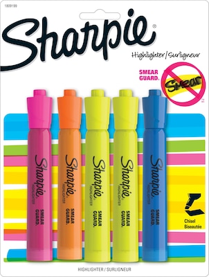 Each Sharpie Accent Tank Style Highlighter has an easy-glide chisel tip for smooth underlining and highlighting. The nontoxic pink, orange, yellow and blue inks in this highlighter pack of five have a large reservoir of Smear Guard ink for a long marking life.