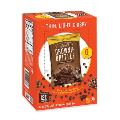 Bite into this chocolate treat for a satisfying and memorable cookie-like crunch. Each piece of brittle is wafer-thin, letting you enjoy a light but crispy edge in every bite. Loaded with chocolate chips, each piece tastes like a gourmet brownie. Each box of Brownie Brittle chocolate chip snacks contains six 1-oz. bags, making them perfect for stocking break rooms or eating on the go.