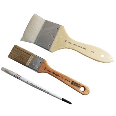 Discover the Silver Brush Ltd. Traditional Background Brush Set, an essential collection for artists seeking to master washes, backgrounds, and intricate details. This set features a carefully curated selection of brushes, each designed to offer maximum moisture retention and color-carrying capacity, ensuring smooth and controlled application. Crafted from organic, natural hair, these brushes are versatile enough for use with all types of colors, including oils, acrylics, watercolors, gouache, inks, and more. Whether you're spreading saturated color with the 1414S Natural White Bristle Flat, adding a soft touch to the painting with the 5514S Alpine White goat hair wide wash brush, or adding delicate details with the 5325S Goat Hair Quill, each brush in this set is designed to enhance your painting experience. With a rich heritage in the art world, Silver Brush Ltd. is dedicated to providing top-quality tools that bring your creative visions to life.