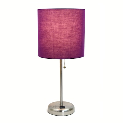 Simple Designs 19.5" Brushed Steel Stick Lamp with Charging Outlet and Purple Fabric Shade, Bedroom, Dorm, Kids Room, Color Changing Led Bulb Included