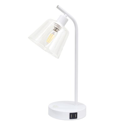 Simple Designs 15.75" Sleek Essentials Modern Industrial Metal Desk Lamp with Clear Glass Shade and Dual USB Ports, for Office, Desk, Nightstand, Dorm, White