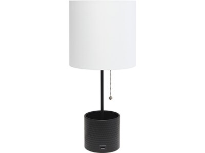 This Simple Designs fun and fashionable lamp features a black hammered metal base and a white fabric shade. The lamp comes equipped with a USB port seated in the base to charge mobile phones, handheld games, tablets, and other small electronics. This lamp will add a fabulous flair to any room. Perfect for bedrooms, kids and teens, college dorms, nurseries, or fun offices.