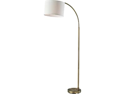 The 64"H Jace floor lamp by Simplee Adesso stylishly illuminates a seating area with overhead lighting that can be controlled with an adjustable shade. The slightly arcing design of this floor lamp makes it a perfect light source for reading in a recliner or working at a desk, while its slender construction makes it easy to position near couches, armchairs, or side tables. For even greater versatility, the lamp's head features an adjustable joint, allowing you to direct the light from a 100W bulb (not included) wherever it's needed. The round antique brass finish base provides stability, while the clean lines in the same finish add a minimalist mid-century modern touch. Topping off the lamp is a short drum shade made of an off-white textured fabric. Operated by a rotary switch to easily turn it on or off, the lamp also includes a 5' clear cord.