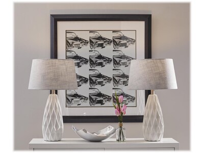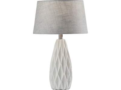 This functional and fashionable Simplee Adesso Joan table lamp will liven up your console table or bedside. The white ceramic base has a unique geometric silhouette, while the gray fabric shade reveals its beautiful texture when lit up. Turn the lamp on and off with a convenient switch on the socket. All Adesso lighting products are either UL or ETL listed, meaning that they have been tested and approved to meet the government-regulated safety standards for the USA. Bulb not included.