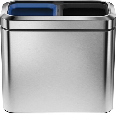 The simplehuman dual compartment slim open can has two inner buckets and a space-efficient shape that make it easy to separate your daily amount of trash and recyclables in one place.