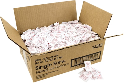 What better way to spice up your office meals than with Single Serve Iodized Salt Packet 3000 Count? This huge box is packed with individual packets of salt that will make any bland lunch or meal taste better. Perfect for stocking in the employee breakroom for general use, or for your next employee party. This Single Serve Iodized Salt Packet 3000 Count is a must have for any office break room and with 3000 packets, it is sure to last a long time.