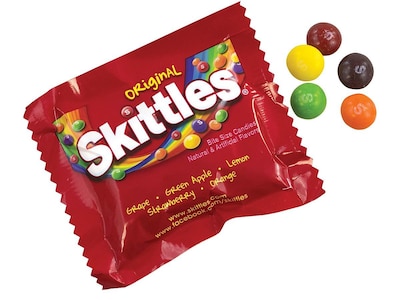 Refresh your break or waiting room candy stash with this large bag of candy. This bulk pack contains 20 small packages of Skittles per pound to supply a round of promotional grab bags or giveaways. Skittles are made in the US and are bursting with fruity flavor.