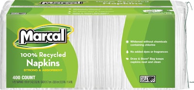 Make certain napkins are readily available for office parties or everyday use with these Marcal Small Steps 100-percent recycled paper napkins. Packaged in large packages with six pouches of 400 napkins each, these are the ideal napkins for use in business settings or in large groups. As an added advantage, each napkin pouch has a drawstring closure to keep the napkins neatly tucked away and clean until use. Created from durable one-ply materials, the napkins are absorbent enough for even big messes.