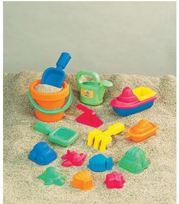 Fun in the sun with this colorful set! This colorful set of plastic sand toys includes everything you need for a fun day at the beach! Assorted sets come with sand molds, rolling truck, bucket, shovels, sieve and more! Bucket: 6" Diameter x 5" H. For ages 3 and up.