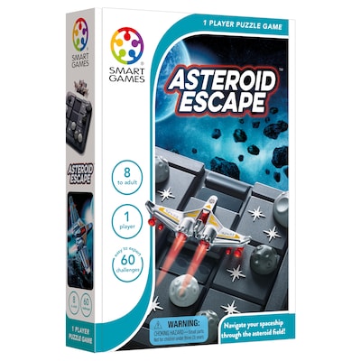 Can you navigate your spaceship through an asteroid field" Your flying skills will be tested to the limit in order to escape! SmartGames Asteroid Escape is a galactic sliding puzzle with 60 missions, from beginner to expert. Includes a game board with lid, making it perfect for travel!