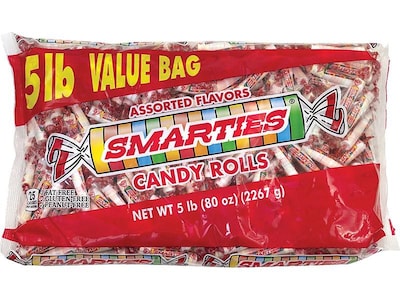 Keep a supply of these conveniently wrapped candies in your break room or reception areas. Each candy wafer is gluten- and nut-free, as well as vegan, making them suitable for a number of dietary needs. These candies come in stacks of assorted flavors, including orange cream, pineapple, cherry, strawberry, grape, and orange. Each 5-pound bag of Smarties contains 60 rolls of wafers, ensuring enough to fill candy dishes in a variety of office settings.