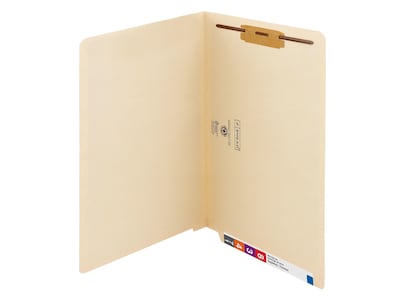 Archive charts, forms and other documents with these legal-size manila fastener file folders. The straight-cut tabs offer ample space for writing or applying labels, while the 11-point manila stock protects contents from dirt, spills and damage. These Smead Shelf-Master manila end-tab file folders come in a pack of 50 units and feature embedded fasteners to hold papers securely.