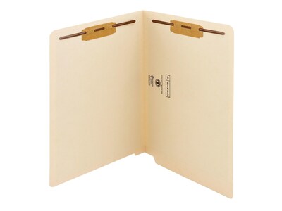 Create a more organized approach to document filing with these Smead Shelf-Master reinforced end-tab 100 percent recycled manila fastener file folders. Organize client or patient documents with these Smead manila fastener file folders. Shelf-Master reinforced end tabs withstand heavy use, and the straight-cut tab design accommodates color-coded filing systems. Two sets of fasteners let you attach paperwork directly to each folder, ensuring sensitive information stays secure inside. Crafted from 100 percent recycled materials, these Smead manila fastener file folders offer a more sustainable file storage solution.