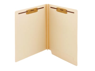 Keep documents sorted with these manila file folders. The straight-cut end tabs provide space for subject labels, and the durable construction stands up to frequent handling. Each of the embedded fasteners holds paperwork securely in place, so you can flip through pages effortlessly. With W-fold edges, these Smead Shelf-Master fastener folders accommodate thick stacks of paper.