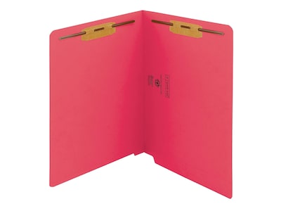 Present documents to customers and clients with these Smead Shelf-Master letter-size fastener file folders. The red color makes it easy to prioritize important files in cabinet drawers, while the reinforced straight-cut tabs provide plenty of space for adding labels and account numbers to each file. These Smead Shelf-Master letter-size fastener file folders come with durable two-prong fasteners, which keep documents securely tucked away.