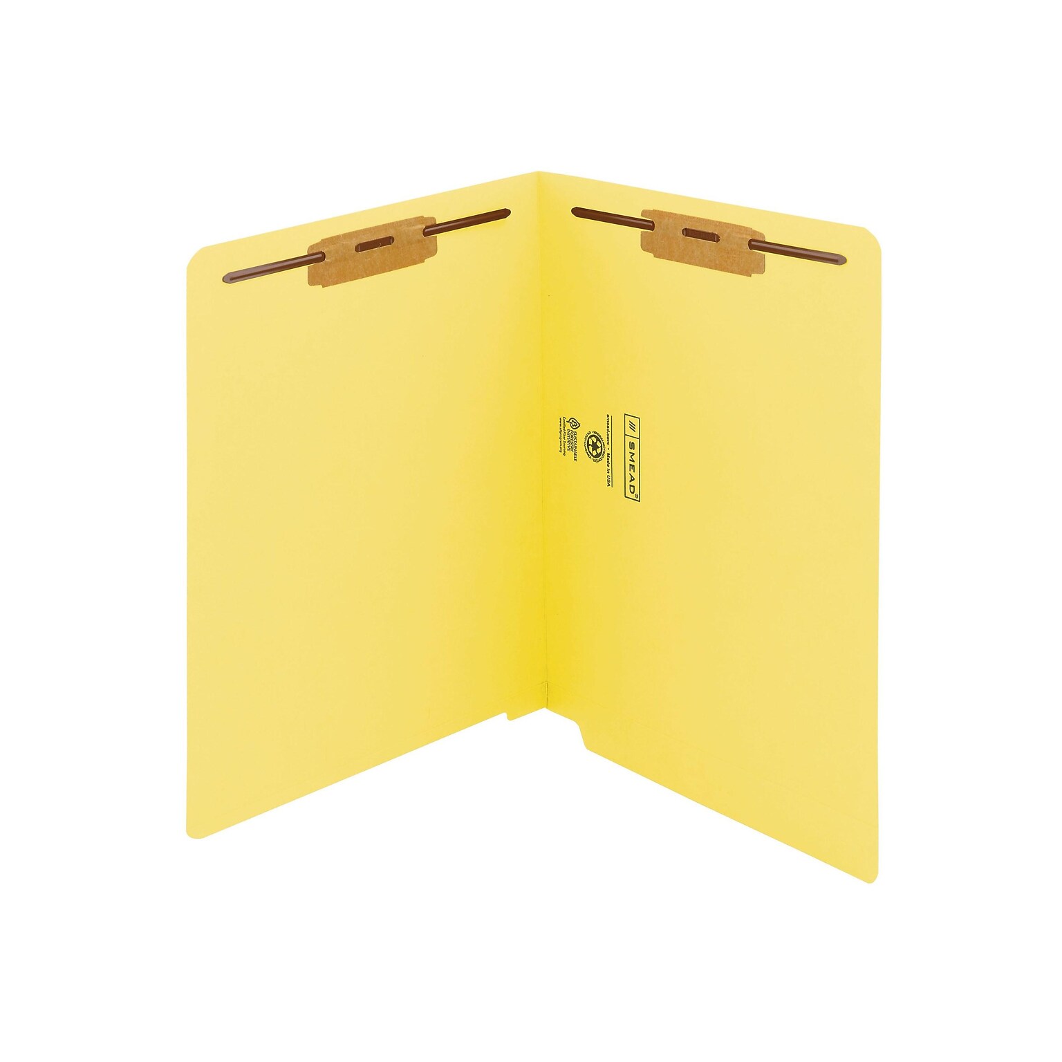 Enhance your filing system with these Smead Shelf-Master letter-size fastener file folders. The reinforced straight-tab design protects against daily wear and tear while providing a large amount of space for labels, and each folder has two fasteners that let you subdivide files. These Smead Shelf-Master letter-size fastener file folders are bright yellow, so they can easily be incorporated into a color-coded filing system.