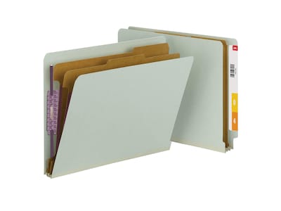Sort documents by client, account number or department with these Smead letter-size pressboard classification folders. The end-tab design works with color-coded labeling systems, while the gray/green hue lends a professional look to all your files. Each folder features two interior dividers for a total of six possible category sections. These Smead letter-size pressboard classification folders come with SafeSHIELD coated fasteners, which prevent paper tears and finger cuts.