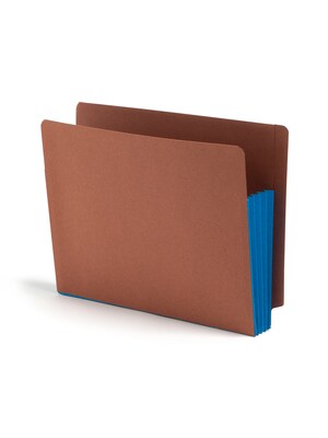 Organize depositions, contracts and other document sets with these drop-front end-tab file pockets. With strong reinforced gussets, these pockets can hold standard top-tab folders without bulging, while the fully lined and reinforced construction prevents splitting and tearing. These Smead redrope extra-wide letter-size brown file pockets come with blue gusset color, making it easy to categorize files by case or subject.